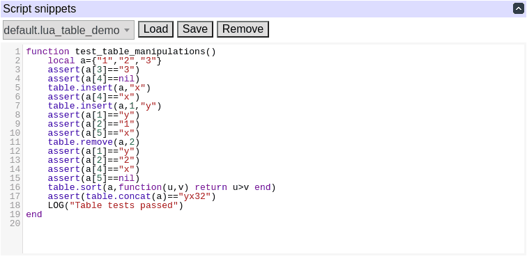The snippet name selector can be used to choose an existing snippet, or to enter a new name, e.g. to create a new snippet or save the current snippet under a different name. Use the "Load" button to load the snippet with the selected name in the snippet editor. Use the "Save" button to save the currently edited snippet under the selected name. The "Remove" button can be used to erase the selected snippet.