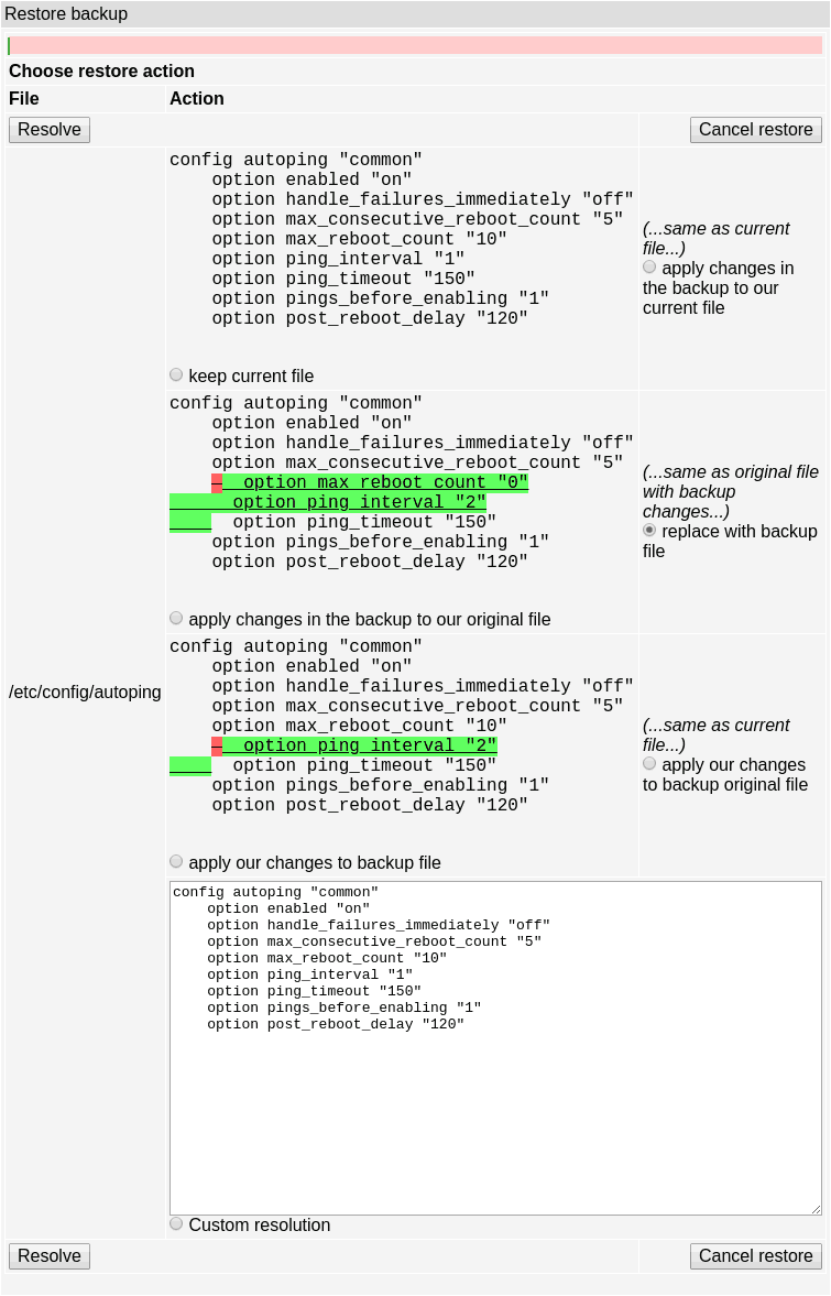 If the restore mode is set to Manual, you choose the action for each file or group. Otherwise, process is determined by the default action that can be chosen in the form below. Semiautomatic restore with a default 'merge' action will ask you to provide a resolution if the merge may be problematic; fully automatic restore mode, or semiautomatic restore with the 'keep' or 'overwrite' default action, uses the same action for all files and groups.