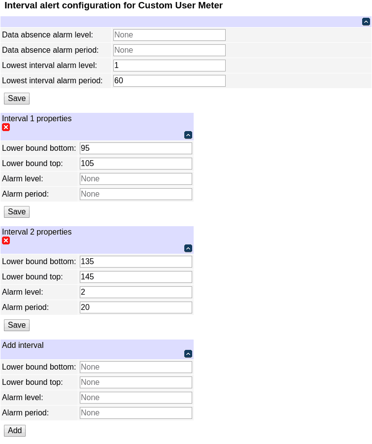 Each interval is characterized by its lower threshold point (with its bottom and top values), its alarm level and period. The exception is the lowest interval which has no threshold point (but still has a level and a period). The "none" value is considered so distinct from all regular values that no hysteresis is possible, so it is also characterized by a level and a period only.