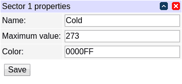 A meter should have one or more sectors, which define different ranges of the value to indicate. The end of one sector's range is the beginning of the next one's range; for the start of the first sector's range, the "minimum value to display" setting is used.