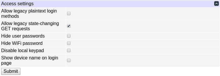 If you need to configure outlets or run scripts on the controller via links or use browsers without JavaScript, you may need to enable the "Allow legacy state-changing GET requests" setting. This allows configuring the controller by following links, but is insecure as you or your browser can be tricked into following such a link. This setting is on by default for compatibility, but is deprecated, and its use is discouraged; it will become disabled by default in future firmware versions, and you're encouraged to disable it manually. Links defined in the Links section will be rewritten on the fly to not require this setting if JavaScript is enabled.