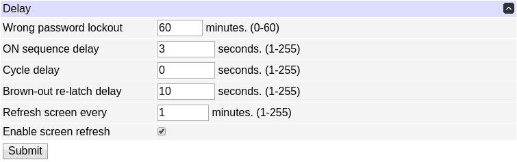 When a time value is entered in the "All ON sequence delay" field, the power controller will pause for a period of time before switching each outlet on in sequence. This delay helps prevent the power surges and blown circuit breakers which can occur when multiple devices are switched on simultaneously. A delay of 60 seconds is suggested for server applications. You may also enter a screen refresh delay in this section. If "Enable screen refresh" is checked, and a delay value is entered, your browser should periodically update the status screen.