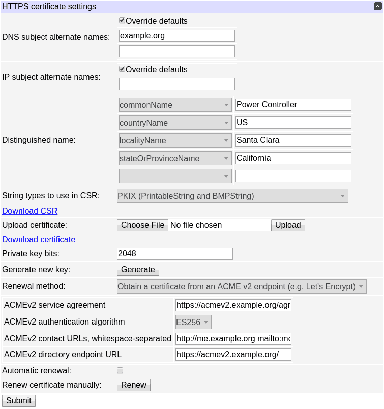 Unlike the key, a certificate is public, not secret, and assures that its holder indeed is the entity it claims to be as long as the client trusts the certificate's issuer. To configure what your LPC9 claims to be, the following certificate signing request (CSR) fields need to be filled: