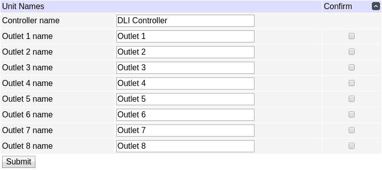 Use the controller name fields to assign a Controller Name to the power controller itself. Examples are "Server Rack Power Strip" or "Plutonium Refinery Control". The Controller Name field appears on the top of the home page. Assign a separate name to each outlet, such as "Missile Launcher" or "Email Server" to make identification of each circuit simple.