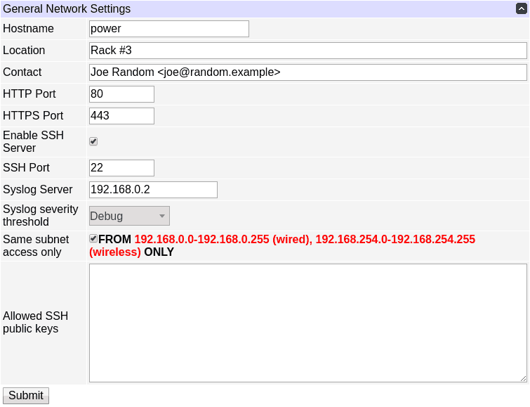 The setup page allows the administrator to configure the power controller. These settings are supported: