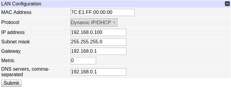 To configure the unit to use static IP assignment, a fixed IP address and network mask must be entered. If a default gateway is specified it must be on the same subnet as the IP address specified. A number of DNS server IP addresses can be supplied separated by commas, e.g. 192.168.0.1,8.8.8.8. If DNS servers are available, some other configuration variables can accept hostnames instead of IP addresses.
