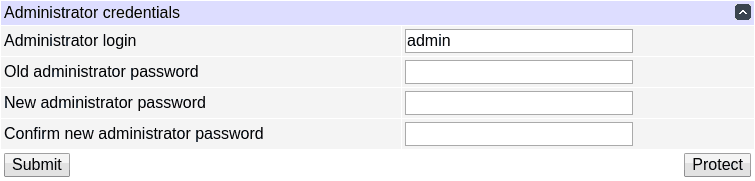 The administrator's username and password can (and should) be changed from the default values. Note that you need to provide the current password for confirmation.