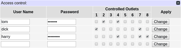 In addition to the administrator, any number of users with individual passwords and outlet permissions may be configured on the setup page. Only the administrator can edit user names and passwords (users can only inspect and switch outlets).