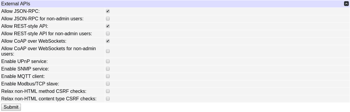 Each of the external APIs can be enabled separately. Command-line REST-like API, or the standalone Lua access library cannot be disabled, except by e.g. disabling SSH access.