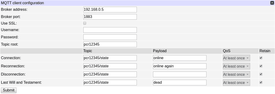 EPCR7 can function as an MQTT client, so you need to have a configured MQTT broker which it could connect to; then, other MQTT clients connected to the same broker could communicate with it (multi-broker configurations are also possible but out of scope of this document). SSL and username/password authentication are supported (leave empty to disable). The default port is 8883 when SSL is enabled, and 1883 otherwise.