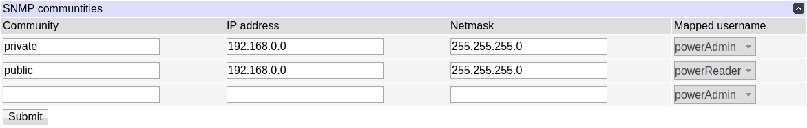 In this example, requests with the 'private' community string will be serviced as though they were made by the 'powerAdmin' user if they come from the 192.168.0.x subnet, and denied otherwise. Likewise, requests with the 'public' community string coming from the same subnet will be served as the 'powerReader' user.