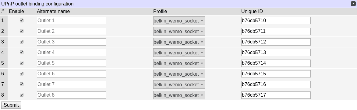 The unit's outlets can be exposed via UPnP as devices with different profiles. The currently supported profile is a Belkin WeMo socket.