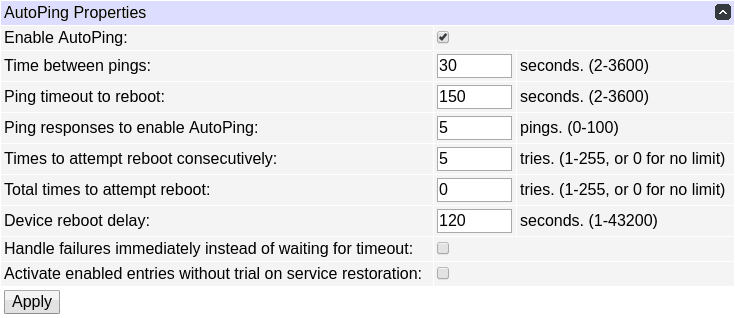 Be sure to enable AutoPing operation by ticking the "Enable AutoPing" checkbox. Certain reset procedures may turn it off automatically.
