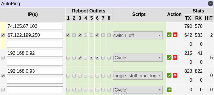 You can select a scripting action to perform when the AutoPing item triggers (by default the selected outlets are cycled). The action must be a function defined in the scripting server, like