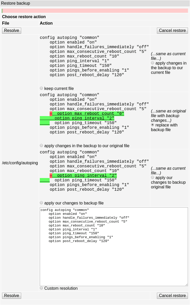 If the restore mode is set to Manual, you choose the action for each file or group. Otherwise, process is determined by the default action that can be chosen in the form below. Semiautomatic restore with a default 'merge' action will ask you to provide a resolution if the merge may be problematic; fully automatic restore mode, or semiautomatic restore with the 'keep' or 'overwrite' default action, uses the same action for all files and groups.