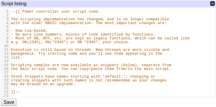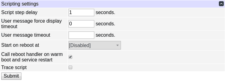 Script code is organized in functions. Configuration items which allow some scripting reaction to an event (reboot, AutoPing failure, etc.) will ask you for the name of the function to call (you will be offered a list of the functions defined in the script).