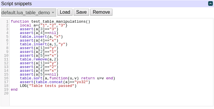 The snippet name selector can be used to choose an existing snippet, or to enter a new name, e.g. to create a new snippet or save the current snippet under a different name. Use the "Load" button to load the snippet with the selected name in the snippet editor. Use the "Save" button to save the currently edited snippet under the selected name. The "Remove" button can be used to erase the selected snippet.