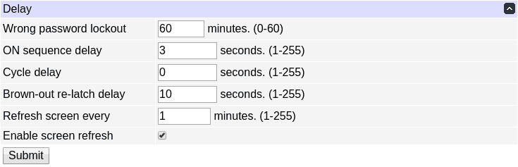 When a time value is entered in the "All ON sequence delay" field, the power controller will pause for a period of time before switching each outlet on in sequence. This delay helps prevent the power surges and blown circuit breakers which can occur when multiple devices are switched on simultaneously. A delay of 60 seconds is suggested for server applications. You may also enter a screen refresh delay in this section. If "Enable screen refresh" is checked, and a delay value is entered, your browser should periodically update the status screen.