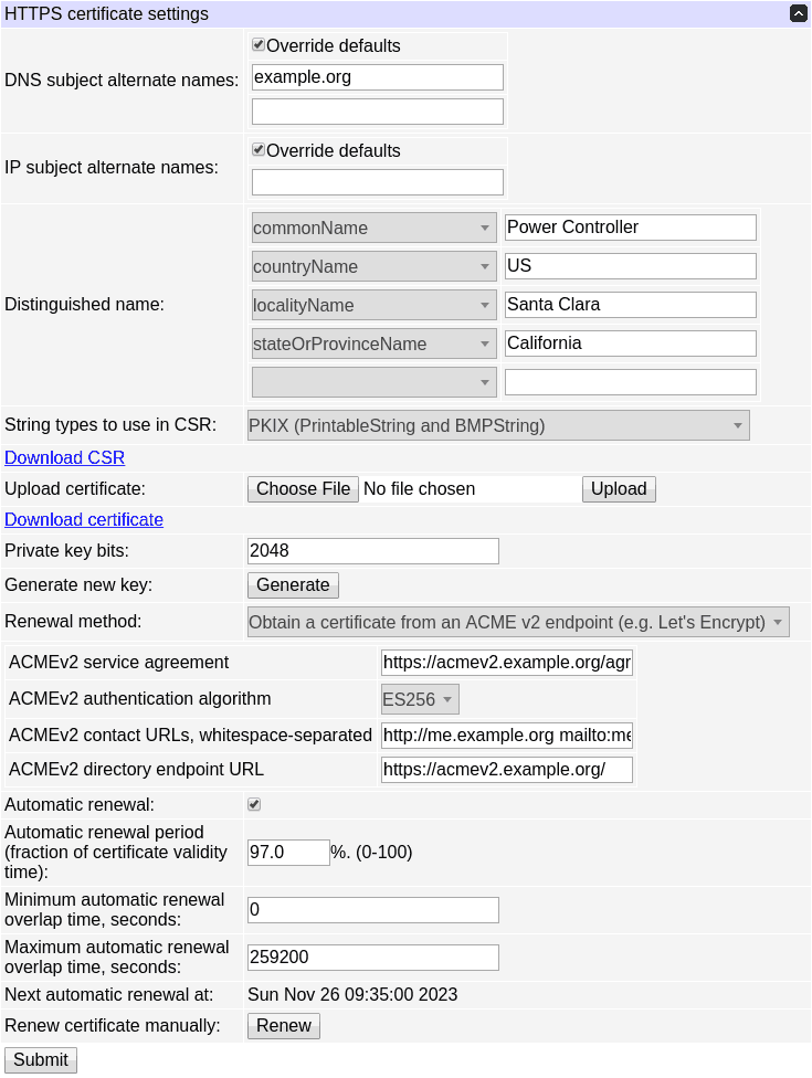The current implementation only supports the http-01 challenge, so the EPCR7 (or the network it is on) needs to be configured so that HTTP requests to the names and addresses specified and port 80 are routed to the unit's HTTP port. Additionally, external account binding, which is required by some CAs, is not yet supported.