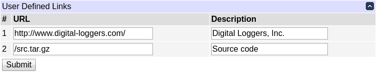 You may link to other power controllers, your own web pages, or remote web sites by entering up to four URLs and descriptions in the Setup page. For example, enter "Site Two Power Controller" in the description field with a URL of "http://192.168.0.250/". These links appear on every page of the main web UI.