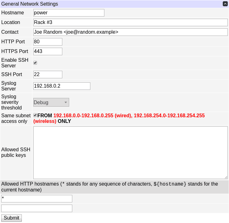 If the unit is accessible only via a private (e.g. RFC1918) IP address, a malicious site can manipulate its DNS entry to trick your browser into sending a request to the private address. Host header restriction can used to prevent such DNS rebinding attacks. The default permitted list contains just the wildcard "*" for backwards compatibility. To enable the protection, add patterns for hostname(s) you use to address the unit to the list and remove the "*" wildcard.