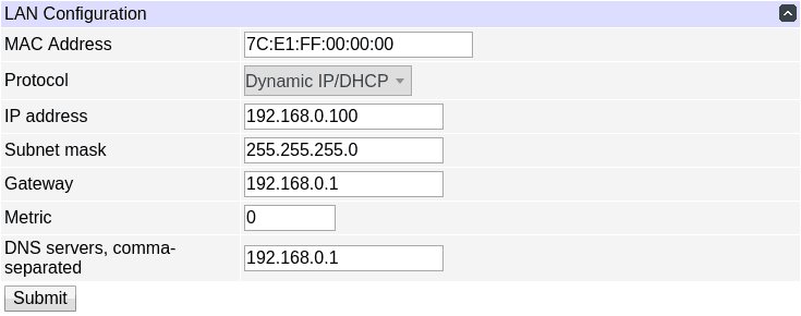 The device MAC address is provided for reference only and cannot be changed in this form. If you need to change the MAC address, you may do so via LCD+keypad, SSH or using the REST-like API. Be sure you know what you're doing, as e.g. assigning a conflicting MAC address, or a broadcast MAC address will make an interface unusable.