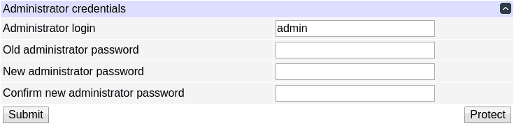 The administrator's username and password can (and should) be changed from the default values. Note that you need to provide the current password for confirmation.