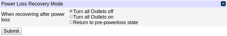 The power loss recovery mode setting has three settings which take effect after a power failure: