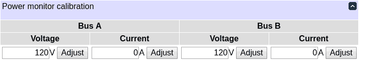 For example, to calibrate bus A voltage, enter the its actual value (measured externally) into the appropriate input field and press "Adjust".