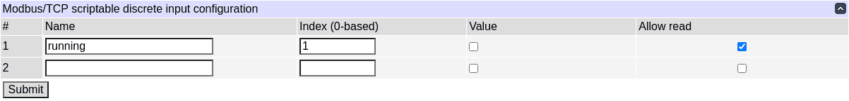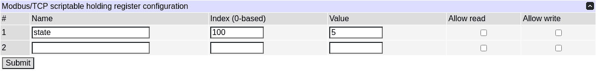 Additionally, discrete inputs, input and holding registers can be created to serve as a common interaction medium between Modbus/TCP and scripting. The configuration can be done using scripting as well as the UI and REST-like APIs.