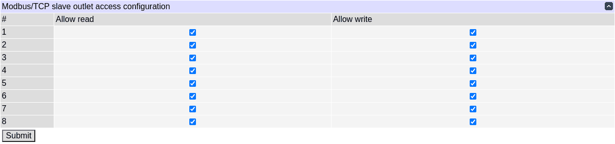 For each relay, read and write permissions can be configured. Reading an inaccessible coil returns OFF, and writing an inaccessible coil has no effect. Only nonexistent elements trigger an "illegal data address" Modbus error.