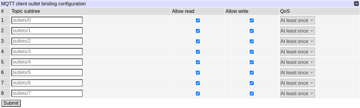 Every relay can be mapped to an MQTT topic subtree, which will be prefixed by the topic root and '/'; the outlet will report its state with a message with that topic if 'Allow read' is checked and honor requests to change its state if it receives a message with that topic suffixed by '/set' and 'Allow write' is checked. The quality of service determines the mode of delivery to request from the broker for messages on reporting relay state; not all brokers may support all delivery modes; the default should be sufficient for most purposes.