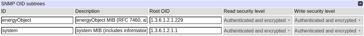In the default configuration, the security level for accessing the energy object MIB subtree is high. You can set the access level to 'Minimal' to interact with the device using SNMPv2c and SNMPv1, or use SNMPv3 instead, which is the recommended and more secure alternative.