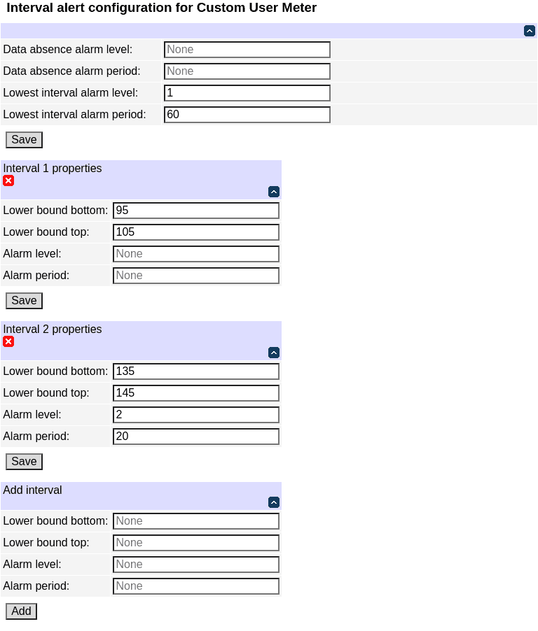 Each interval is characterized by its lower threshold point (with its bottom and top values), its alarm level and period. The exception is the lowest interval which has no threshold point (but still has a level and a period). The "none" value is considered so distinct from all regular values that no hysteresis is possible, so it is also characterized by a level and a period only.