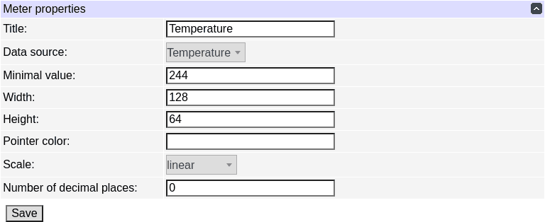 A meter should have one or more sectors, which define different ranges of the value to indicate. The end of one sector's range is the beginning of the next one's range; for the start of the first sector's range, the "minimum value to display" setting is used.