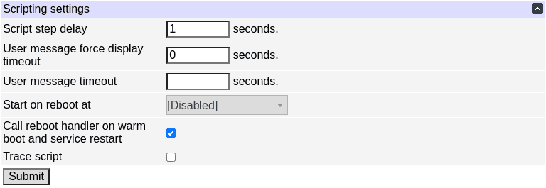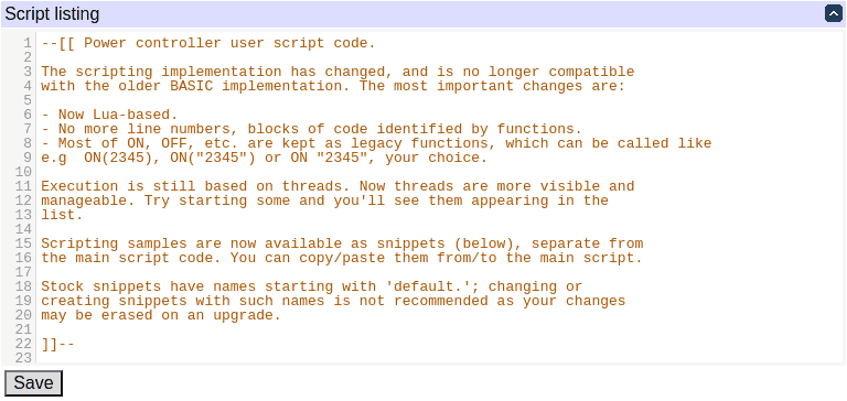 Script code is organized in functions. Configuration items which allow some scripting reaction to an event (reboot, AutoPing failure, etc.) will ask you for the name of the function to call (you will be offered a list of the functions defined in the script).