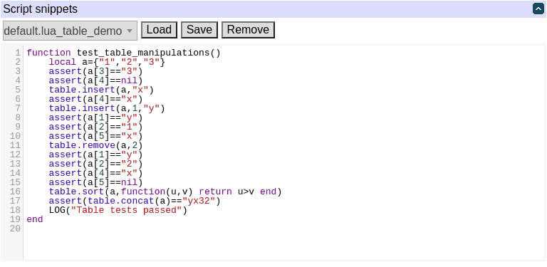 The snippet name selector can be used to choose an existing snippet, or to enter a new name, e.g. to create a new snippet or save the current snippet under a different name. Use the "Load" button to load the snippet with the selected name in the snippet editor. Use the "Save" button to save the currently edited snippet under the selected name. The "Remove" button can be used to erase the selected snippet.