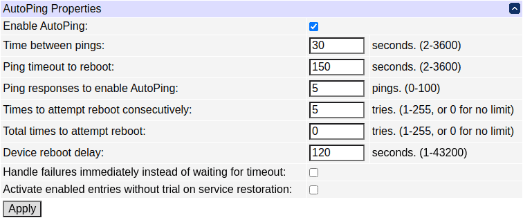Be sure to enable AutoPing operation by ticking the "Enable AutoPing" checkbox. Certain reset procedures may turn it off automatically.