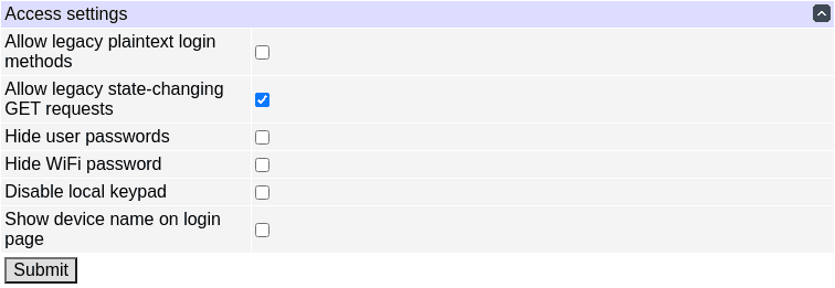 If you need to configure outlets or run scripts on the controller via links or use browsers without JavaScript, you may need to enable the "Allow legacy state-changing GET requests" setting. This allows configuring the controller by following links, but is insecure as you or your browser can be tricked into following such a link. This setting is on by default for compatibility, but is deprecated, and its use is discouraged; it will become disabled by default in future firmware versions, and you're encouraged to disable it manually. Links defined in the Links section will be rewritten on the fly to not require this setting if JavaScript is enabled.