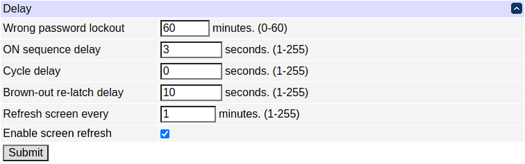 When a time value is entered in the "All ON sequence delay" field, the power controller will pause for a period of time before switching each outlet on in sequence. This delay helps prevent the power surges and blown circuit breakers which can occur when multiple devices are switched on simultaneously. A delay of 60 seconds is suggested for server applications. You may also enter a screen refresh delay in this section. If "Enable screen refresh" is checked, and a delay value is entered, your browser should periodically update the status screen.