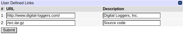 You may link to other power controllers, your own web pages, or remote web sites by entering up to four URLs and descriptions in the Setup page. For example, enter "Site Two Power Controller" in the description field with a URL of "http://192.168.0.250/". These links appear on every page of the main web UI.