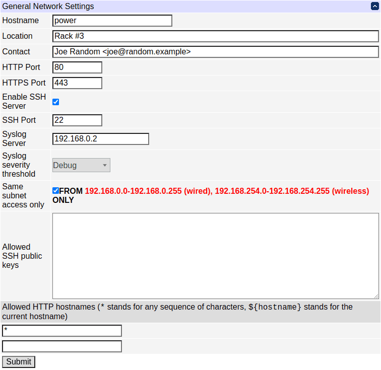 If the unit is accessible only via a private (e.g. RFC1918) IP address, a malicious site can manipulate its DNS entry to trick your browser into sending a request to the private address. Host header restriction can used to prevent such DNS rebinding attacks. The default permitted list contains just the wildcard "*" for backwards compatibility. To enable the protection, add patterns for hostname(s) you use to address the unit to the list and remove the "*" wildcard.