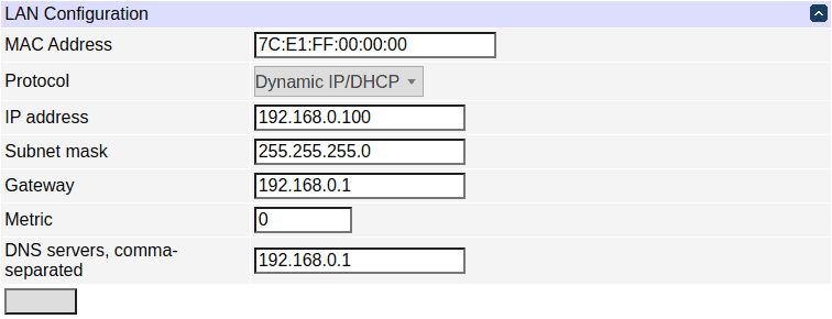 The device MAC address is provided for reference only and cannot be changed in this form. If you need to change the MAC address, you may do so via LCD+keypad, SSH or using the REST-like API. Be sure you know what you're doing, as e.g. assigning a conflicting MAC address, or a broadcast MAC address will make an interface unusable.