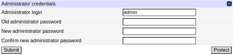 The administrator's username and password can (and should) be changed from the default values. Note that you need to provide the current password for confirmation.