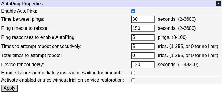 Be sure to enable AutoPing operation by ticking the "Enable AutoPing" checkbox. Certain reset procedures may turn it off automatically.